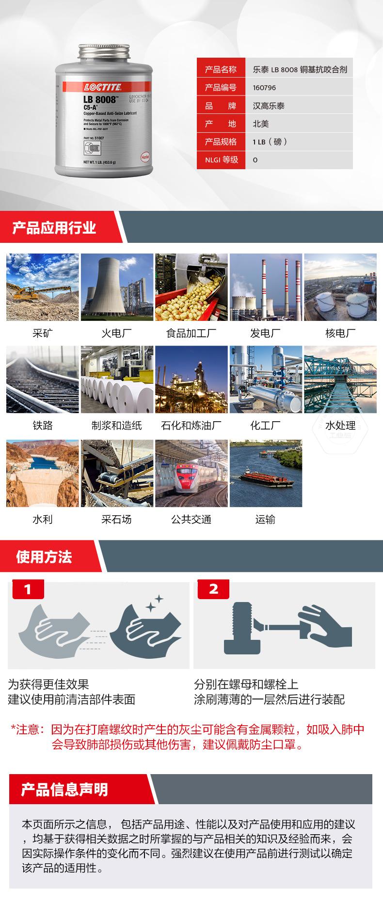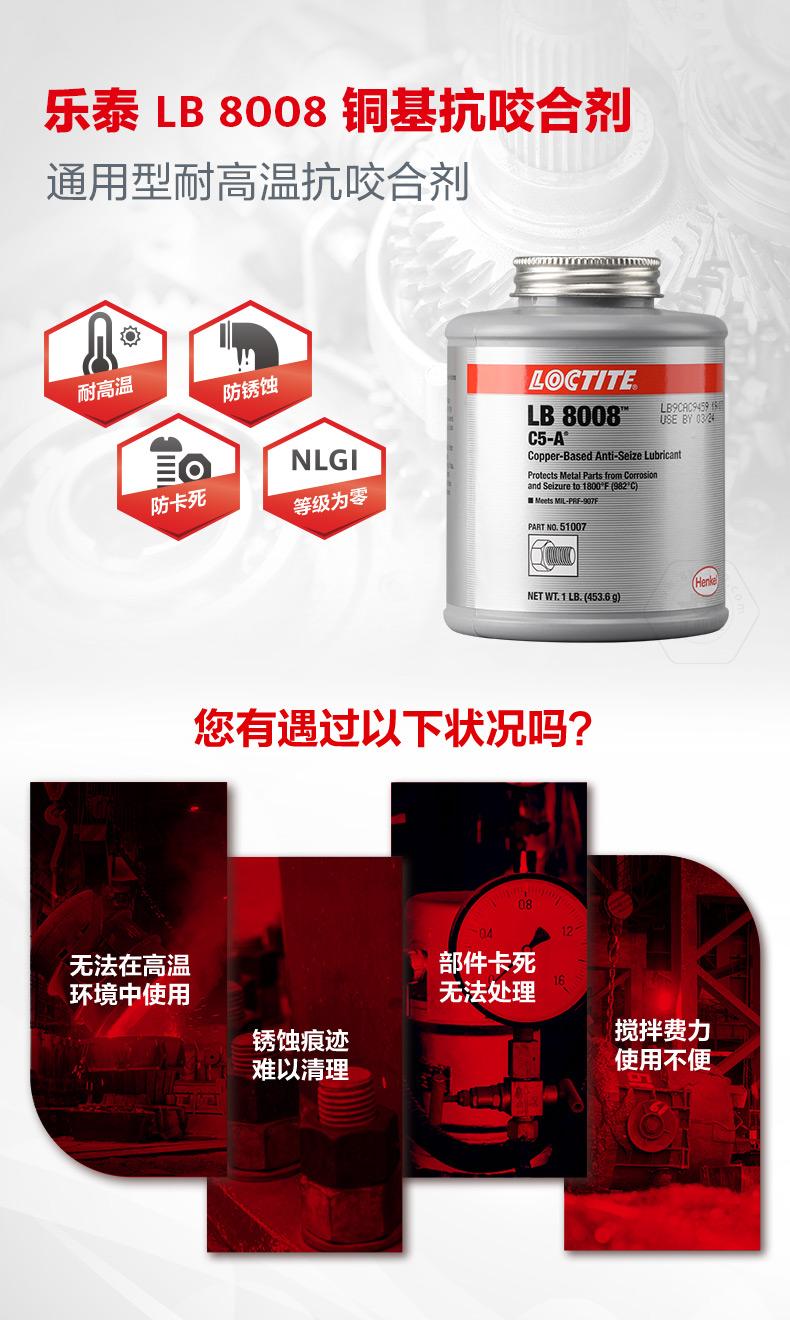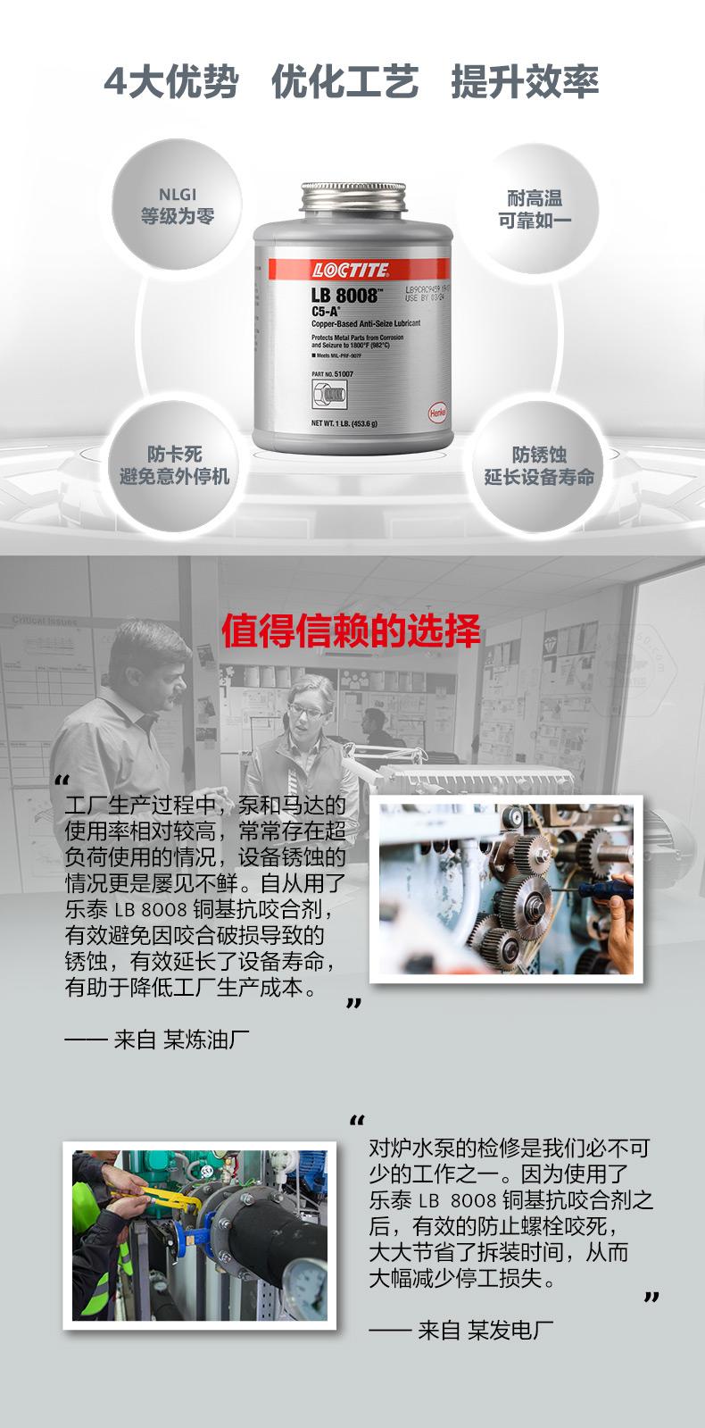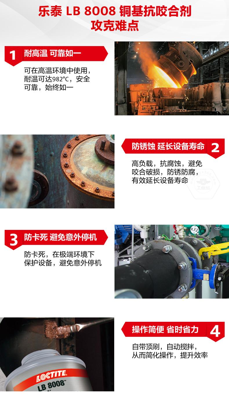 樂泰LB8008銅基抗咬合劑是一款通用型耐高溫抗咬合劑。樂泰LB8008銅基抗咬合劑耐溫可達982℃,具備防銹蝕、防卡死、NLGI等級為0等特點。樂泰LB8008銅基抗咬合劑適用于高負載和極端環(huán)境,可幫助避免咬合破損、延長設備壽命、減少意外停機。樂泰LB8008銅基抗咬合劑自帶頂刷并可自動攪拌,操作更簡便,適用于采礦、發(fā)電、石化、鐵路、水處理等行業(yè)。