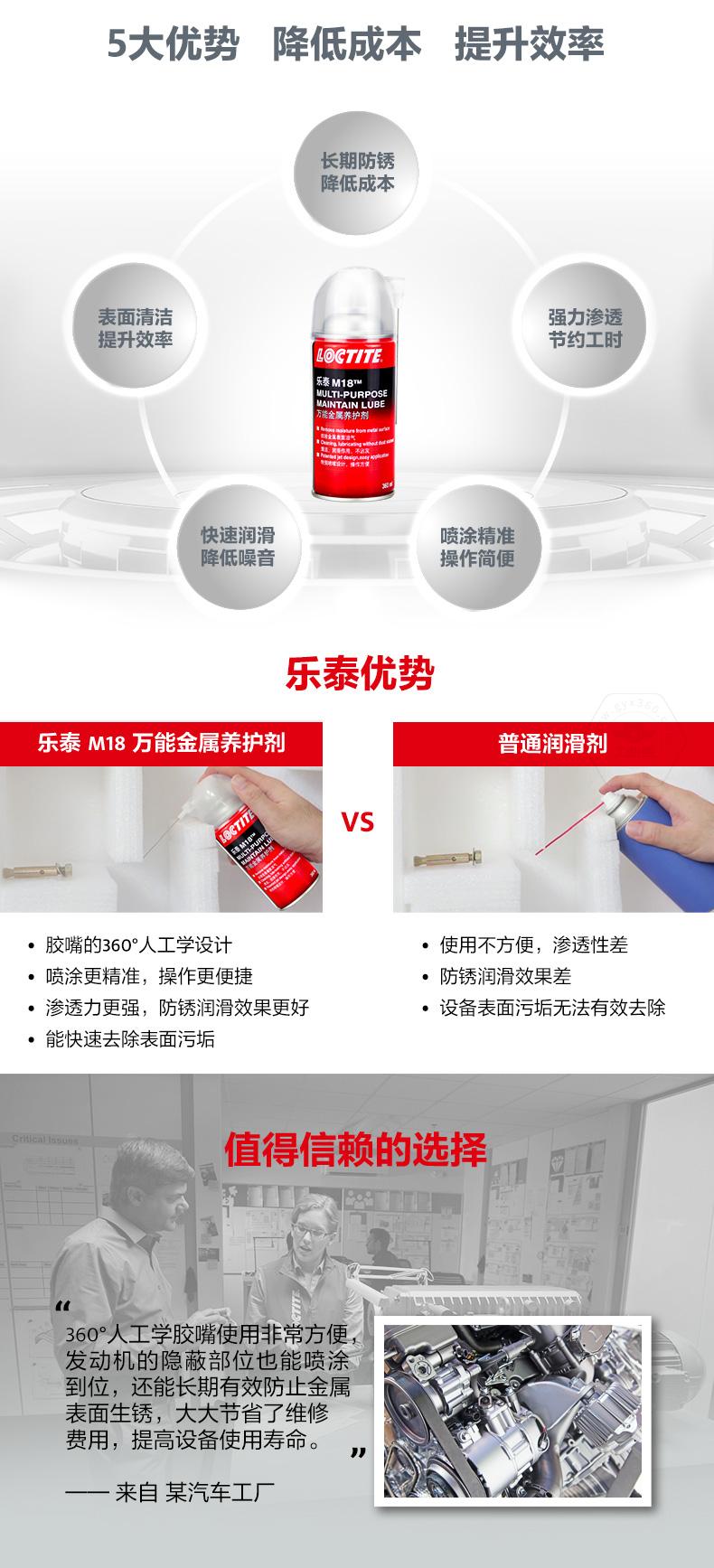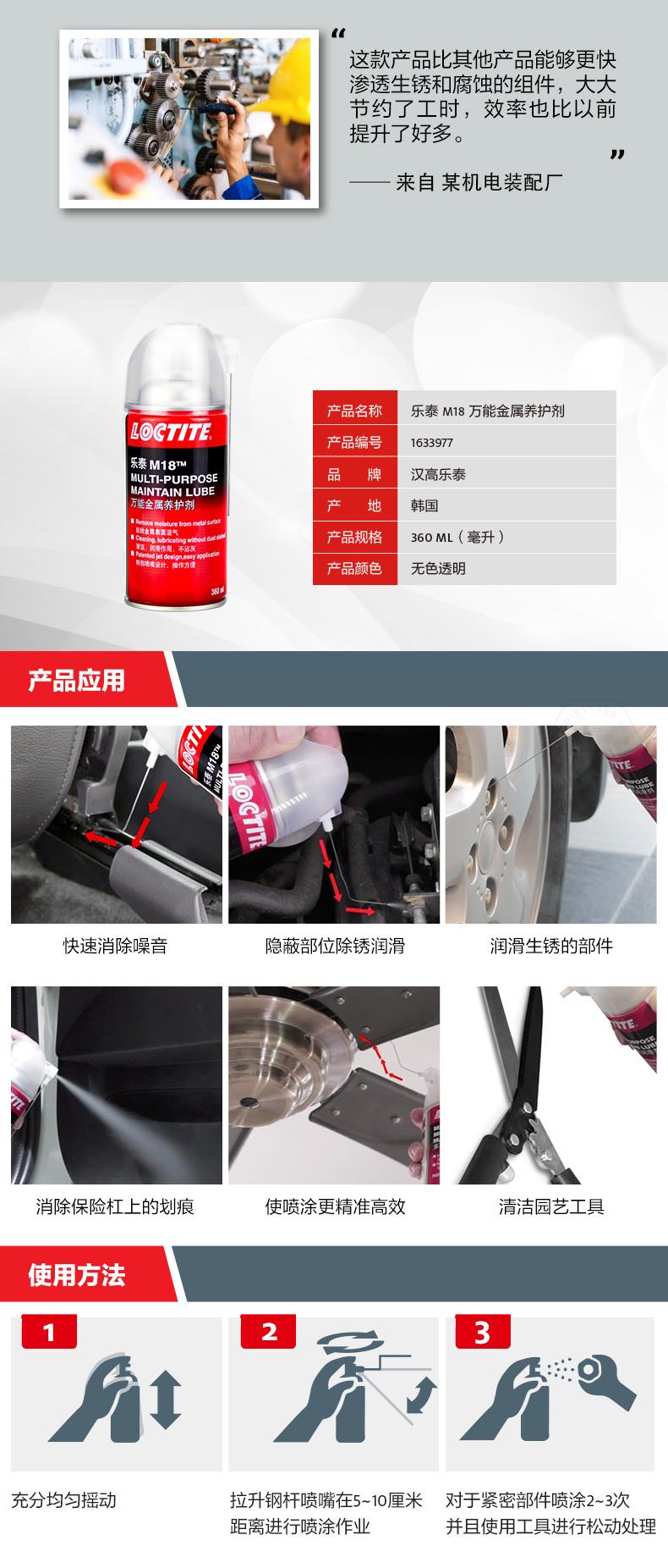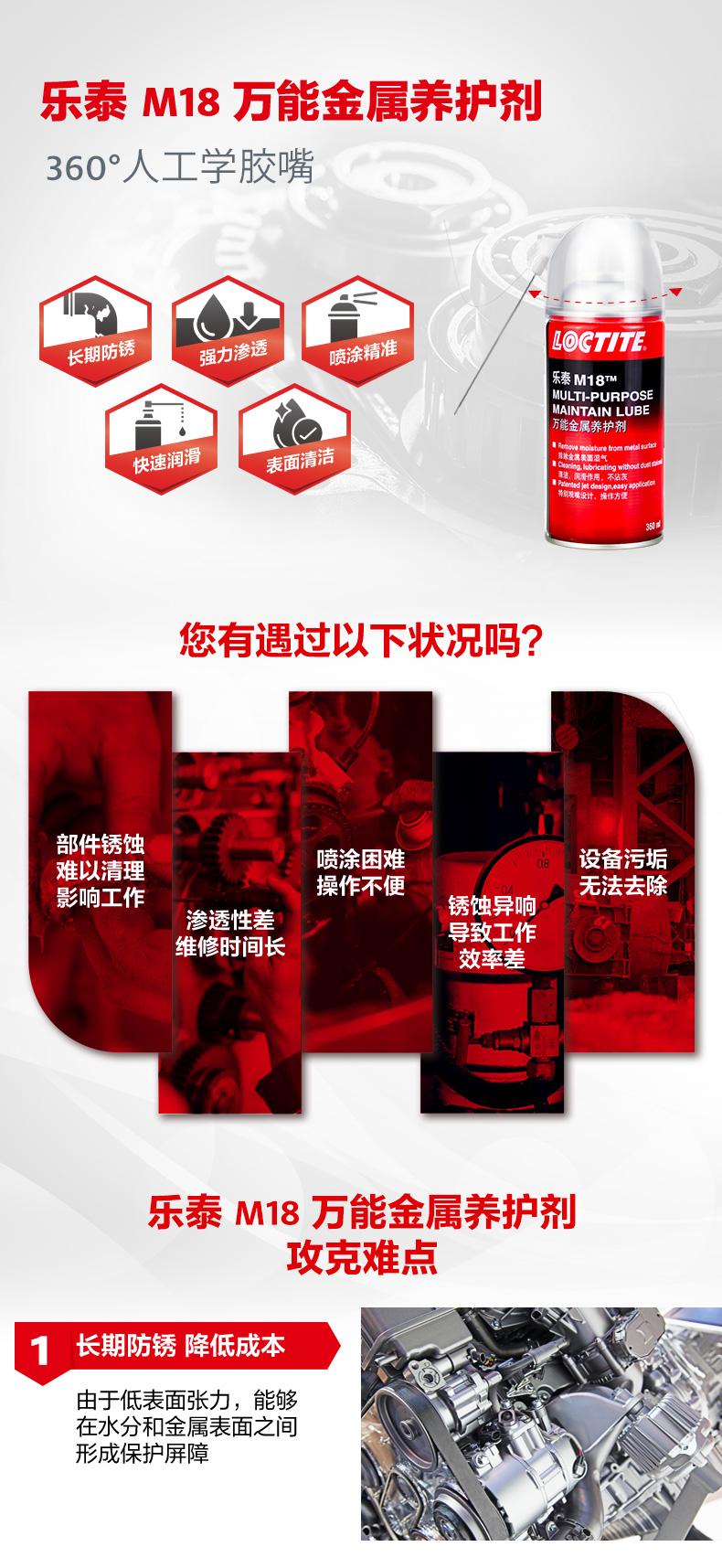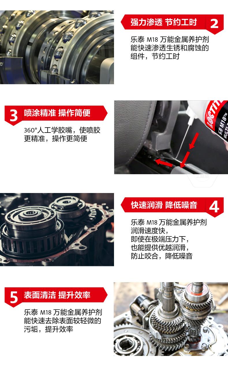 樂(lè)泰M18萬(wàn)能金屬養(yǎng)護(hù)劑是一款集防銹、滲透、潤(rùn)滑、清潔于一體的產(chǎn)品。樂(lè)泰M18萬(wàn)能金屬養(yǎng)護(hù)劑由于低表面張力,能夠在水分和金屬表面之間形成保護(hù)屏障,實(shí)現(xiàn)長(zhǎng)期防銹。樂(lè)泰M18萬(wàn)能金屬養(yǎng)護(hù)劑可快速滲透生銹和腐蝕組件,節(jié)約工時(shí)。樂(lè)泰M18萬(wàn)能金屬養(yǎng)護(hù)劑采用360°人工學(xué)膠嘴,噴涂更精準(zhǔn),操作更簡(jiǎn)便,還可快速潤(rùn)滑并降低噪音,同時(shí)去除表面較輕微污垢,提升效率。