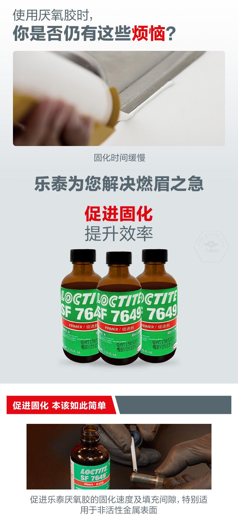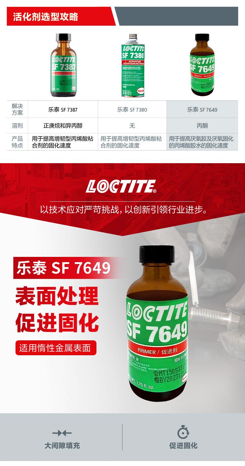 樂泰SF7649是一款用于表面處理、促進固化的溶劑型促進劑。樂泰SF7649適用于惰性金屬表面,可促進樂泰厭氧膠在非活性金屬表面的固化速度,并兼顧大間隙填充需求。對于需要加快固化速度、間隙較大,或一般在10℃以下使用促進劑的場景,樂泰SF7649更有針對性。樂泰SF7649規(guī)格為1.75oz和4.5oz,外觀為透明、綠色,溶劑類型為丙酮,溶劑揮發(fā)時間30-70秒,粘度2mPa·s,在件壽命≤30天,質(zhì)保期18個月(8-21℃陰涼干燥處)。