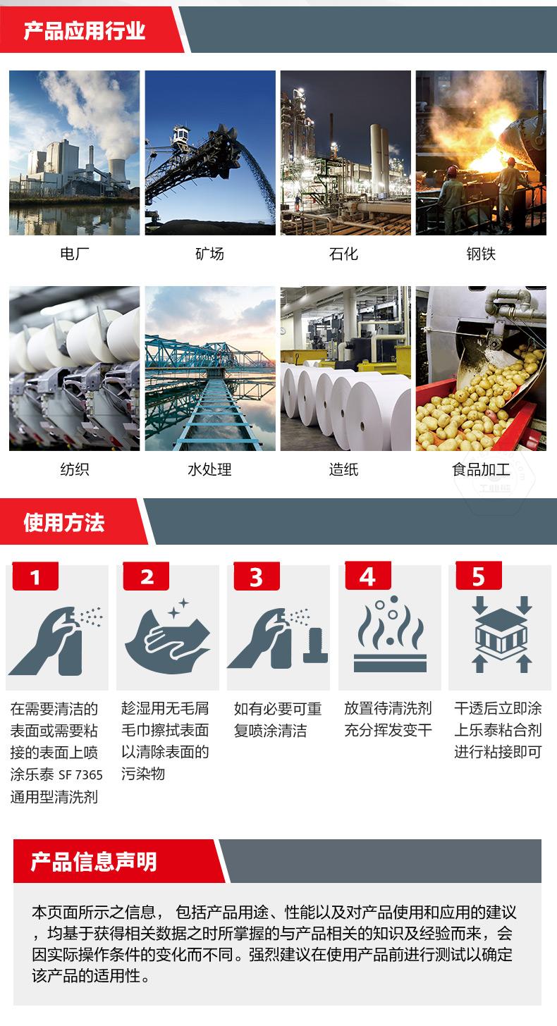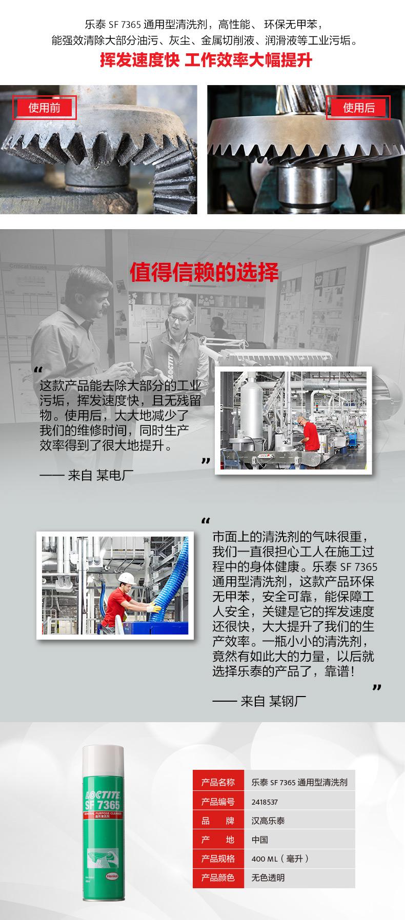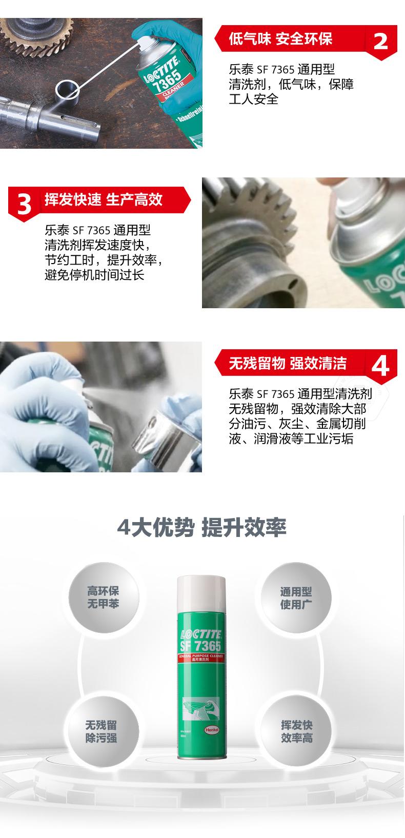 樂泰SF7365通用型清洗劑是一款高性能、環(huán)保無甲苯的零部件清洗劑。樂泰SF7365通用型清洗劑低氣味,使用更安全;樂泰SF7365通用型清洗劑揮發(fā)快,可節(jié)約工時(shí)、提升效率。對(duì)于油污、灰塵、金屬切削液、潤滑液等工業(yè)污垢,樂泰SF7365通用型清洗劑可實(shí)現(xiàn)無殘留強(qiáng)效清潔,適用范圍覆蓋電廠、礦場(chǎng)、石化、鋼鐵、紡織、水處理、造紙和食品加工行業(yè)。
